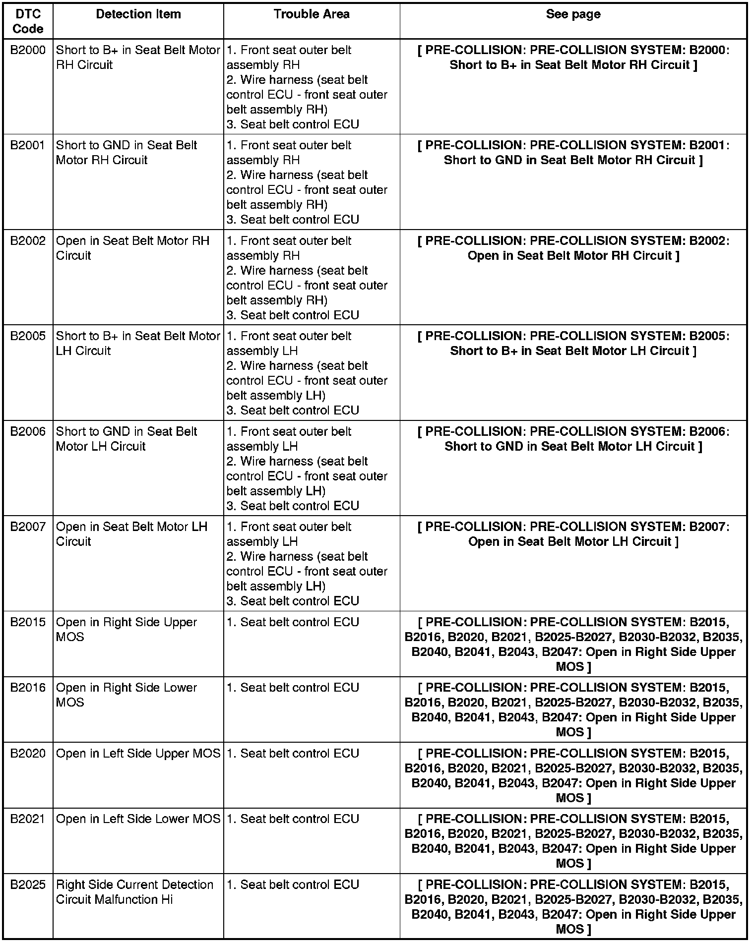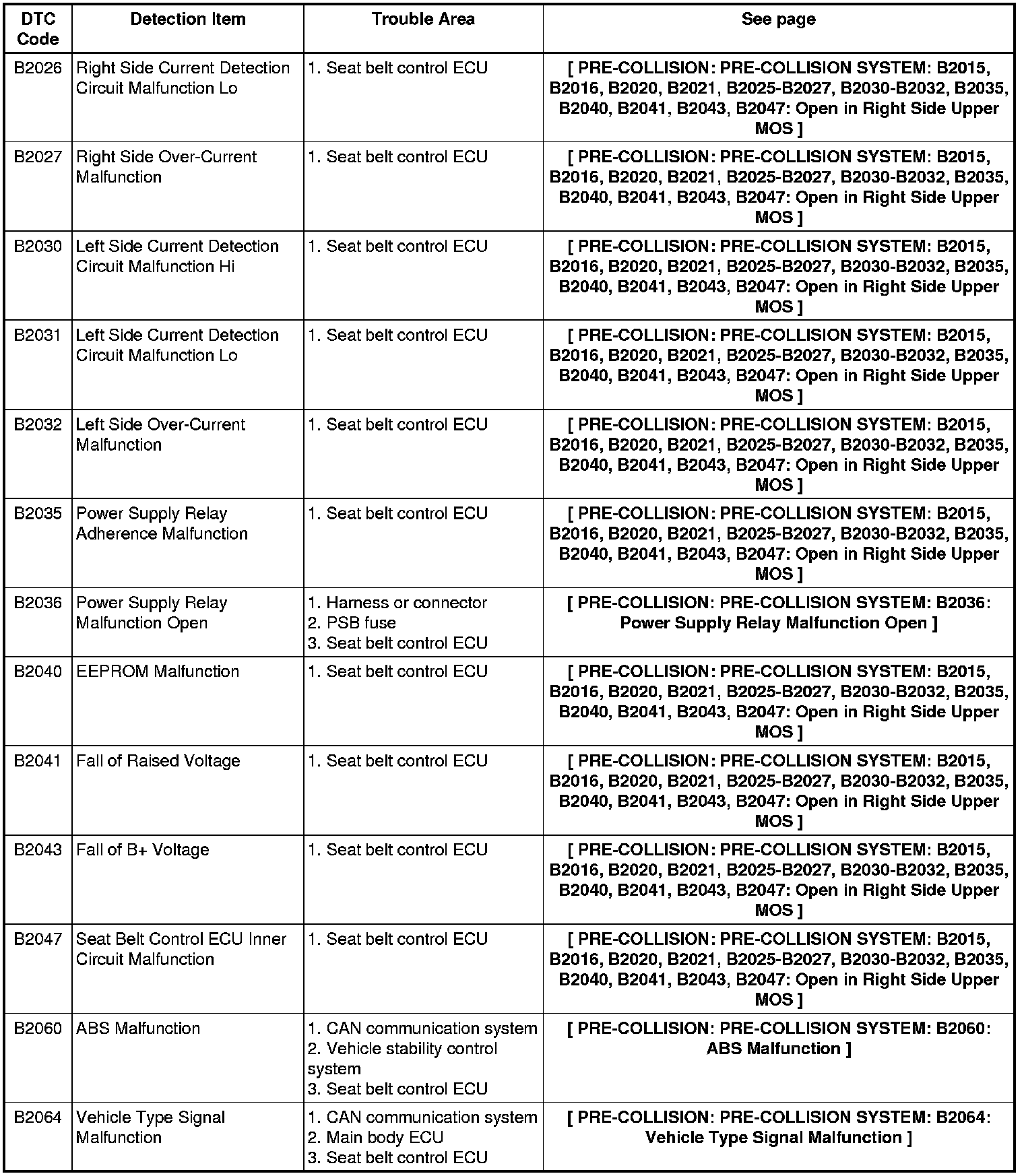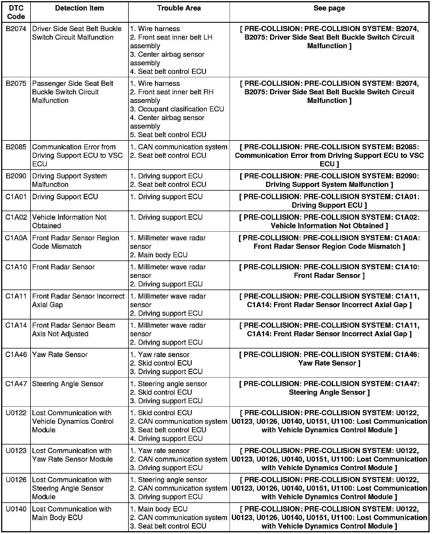 PRE-COLLISION: PRE-COLLISION SYSTEM: DIAGNOSTIC TROUBLE CODE CHART
