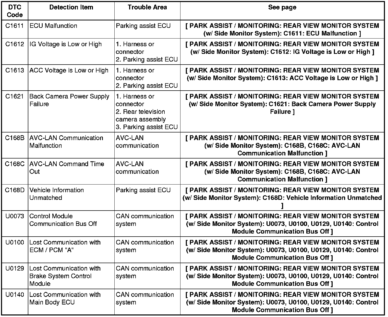 PARK ASSIST / MONITORING: REAR VIEW MONITOR SYSTEM (w/ Side Monitor System): DIAGNOSTIC TROUBLE CODE CHART