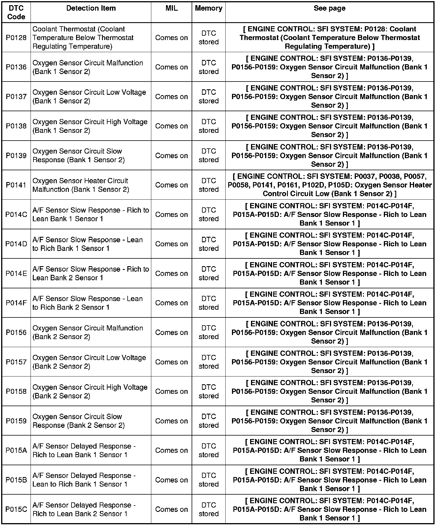 Parameters listed in the chart may not be exactly the same as your readings due to the type of instrument or other factors. If a trouble code is displayed during the DTC check, inspect the trouble areas listed for that code. For details of the code, follow the "See page" reference.