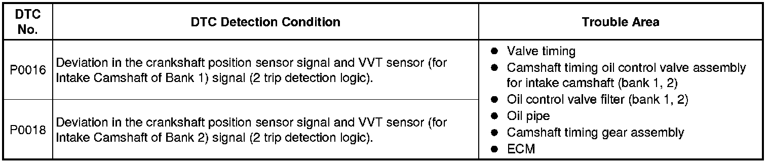 DTC P0016 or P0018 is output when foreign objects in engine oil are caught in some parts of the system. These codes will remain stored even if the system returns to normal after a short time. These foreign objects may then be captured by the oil filter, thus eliminating the source of the problem.