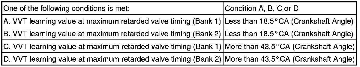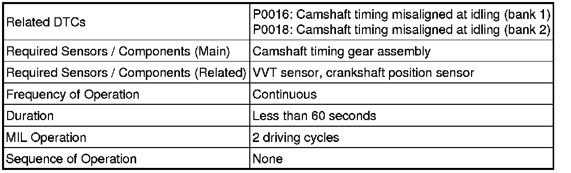 To monitor the correlation of the intake camshaft position and crankshaft position, the ECM checks the VVT learned value while the engine is idling. The VVT learned value is calibrated based on the camshaft position and crankshaft position. The intake valve timing is set to the most retarded angle while the engine is idling. If the VVT learned value is out of the specified range in consecutive driving cycles, the ECM illuminates the MIL and stores DTC P0016 (bank 1) or P0018 (bank 2).