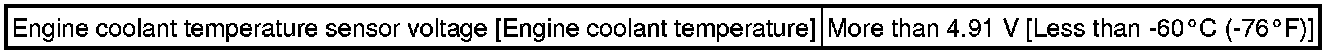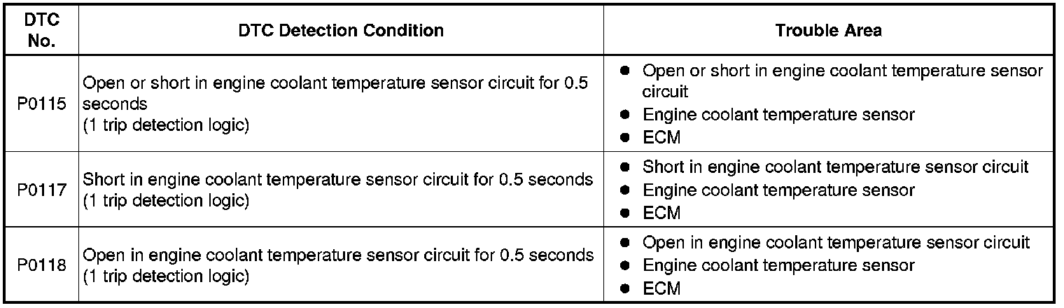 - If the sensor output voltage is more than 4.91 V for 0.5 seconds or more, the ECM determines that there is an open in the engine coolant temperature sensor circuit, and sets DTC P0118. Conversely, if the voltage output is less than 0.14 V for 0.5 seconds or more, the ECM determines that there is a short in the sensor circuit, and sets DTC P0117.