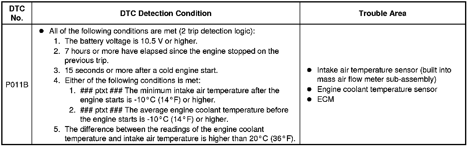 - For diagnosis, in order to duplicate the detection conditions of the DTC, it is necessary to park the vehicle for 7 hours. Parking the vehicle for 7 hours ensures that the actual temperature of the engine coolant temperature and intake air temperature are very similar. When the vehicle has been parked for less than 7 hours, differences in the readings may exist. This does not necessarily indicate a fault.