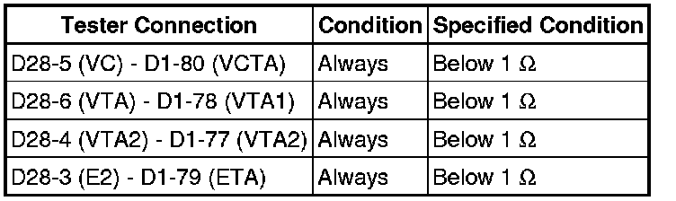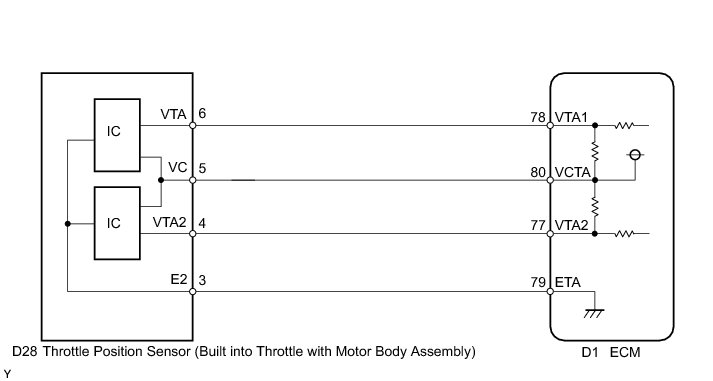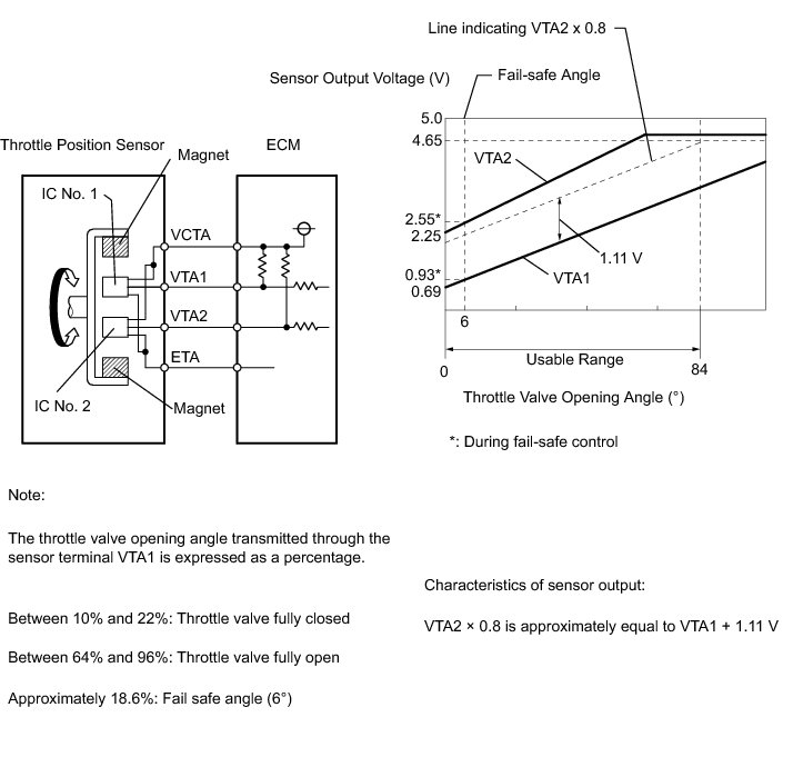 The throttle position sensor has 2 sensor circuits, each of which transmits a signal VTA1 and VTA2. VTA1 is used to detect the throttle valve angle and VTA2 is used to detect malfunctions in VTA1. The sensor signal voltages vary between 0 V and 5 V in proportion to the throttle valve opening angle, and are transmitted to the VTA1 terminals of the ECM.