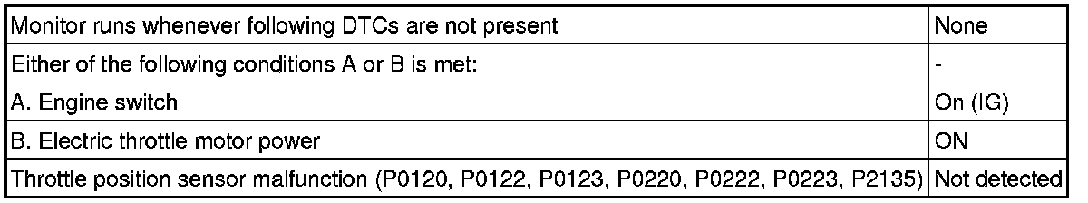 For each throttle opening angle, a specific voltage difference is expected between the outputs of VTA1 and VTA2. If the output voltage difference between the two signals deviates from the normal operating range, the ECM interprets this as a malfunction of the throttle position sensor. The ECM illuminates the MIL and stores the DTC.