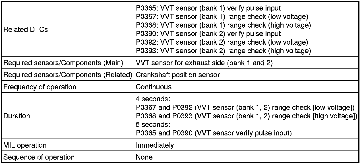 P0367, P0392, P0368, P0393: VVT Sensor Range Check (Low Voltage, High Voltage)