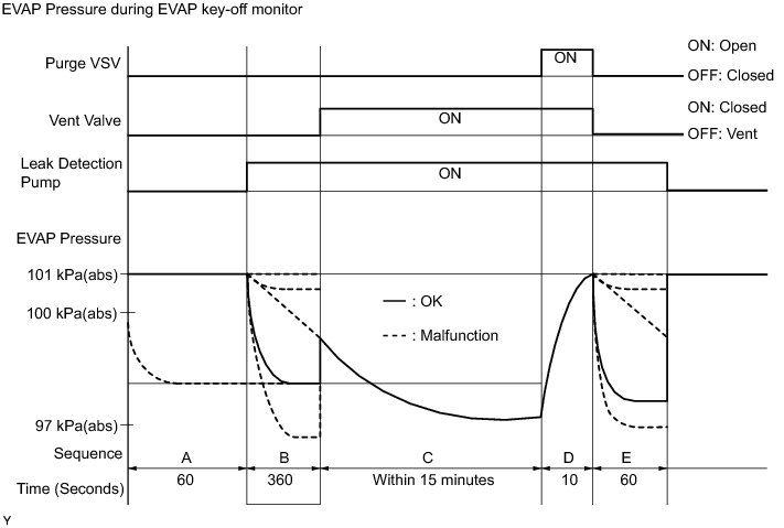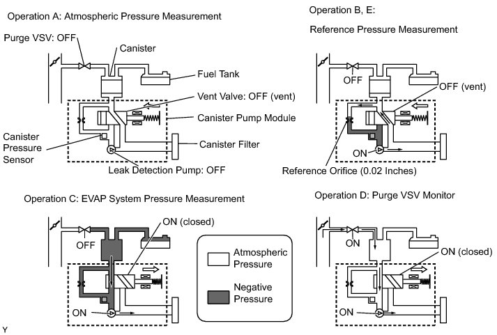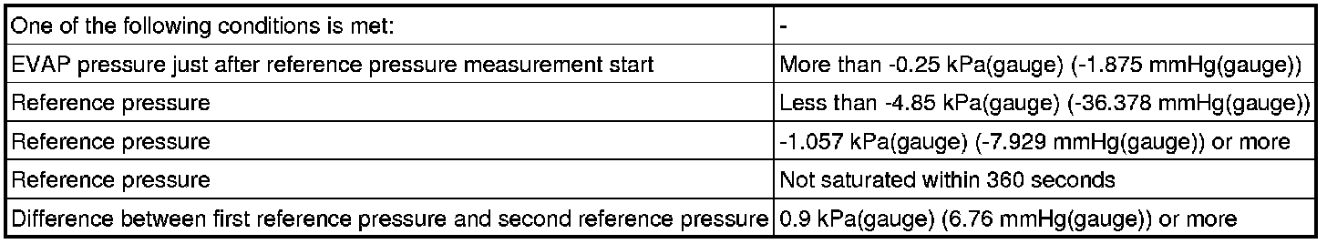 The leak detection pump creates negative pressure through the reference orifice. When the system is normal, the EVAP pressure is in between 97 to 100 kPa(abs) [728 mmHg to 750 mmHg(abs)]* and saturated within a minute.