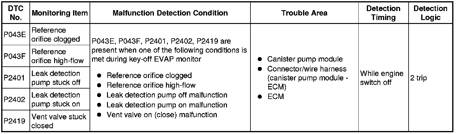 5 hours*1 after the engine switch is turned off, the leak detection pump creates negative pressure (vacuum) in the EVAP (Evaporative Emission) system. The ECM monitors for leaks and actuator malfunctions based on the EVAP pressure.