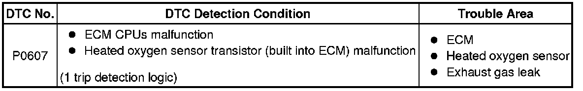 - If DTC P0607 and P0136, P0137, P0138, P0156, P0157 or P0158 are output, the output voltage of the heated oxygen sensor may remain close to 0 V or become high (around 1 V or more).