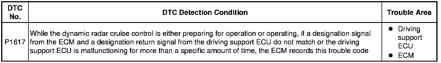 In the dynamic radar cruise control system, the ECM and the driving support ECU (distance control ECU) communicate with one another to control the system based on some designation information. If the designation information of the ECM and driving support ECU is different or the driving support ECU is malfunctioning, this DTC is recorded.
