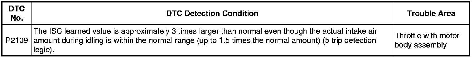 If there are deposits in the throttle valve, a decrease in the ISC flow rate may cause engine stall or unstable idling. Therefore, the necessary ISC flow rate for idling is maintained using the ISC learned value and feedback. The ECM stores this DTC if the ISC learned value approaches its limit. The ECM begins monitoring for the DTC detection conditions when the following preconditions are met: