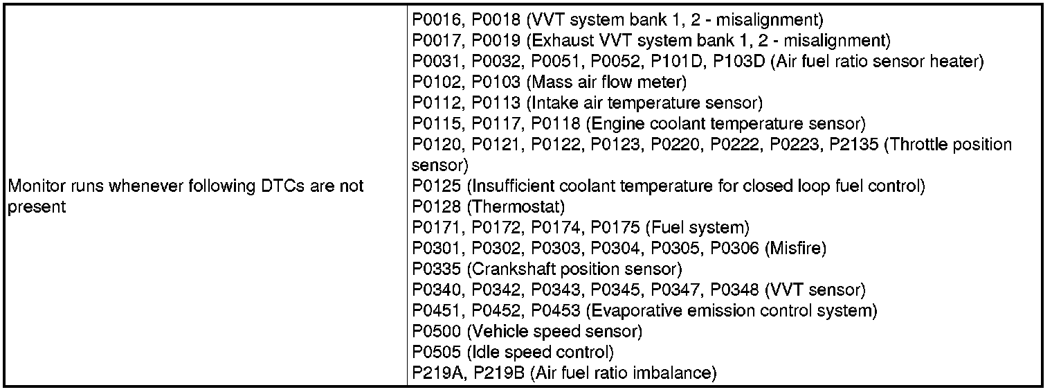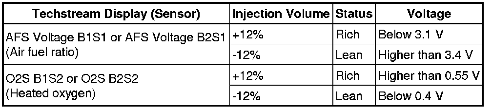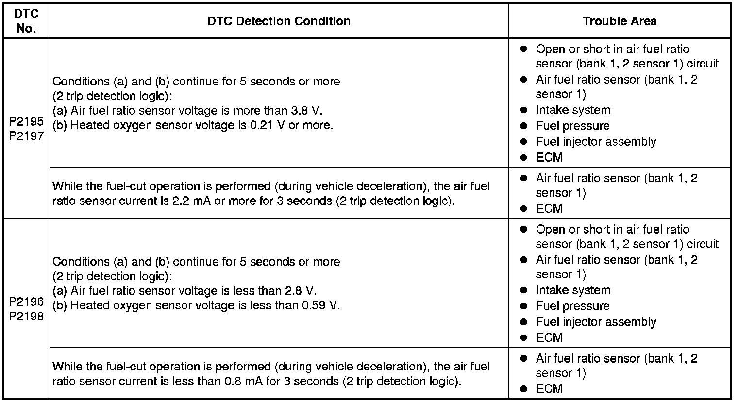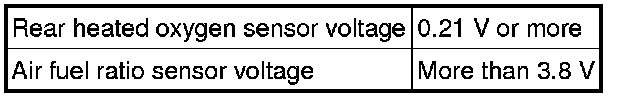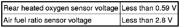 Under air-fuel ratio feedback control, if the air fuel ratio sensor output voltage is less than 2.8 V (very rich condition) for 5 seconds despite the rear heated oxygen sensor output voltage being less than 0.59 V, the ECM stores DTC P2196 or P2198. Alternatively, if the air fuel ratio sensor output voltage is more than 3.8 V (very lean condition) for 5 seconds despite the rear heated oxygen sensor output voltage being 0.21 V or more, DTC P2195 or P2197 is stored.
