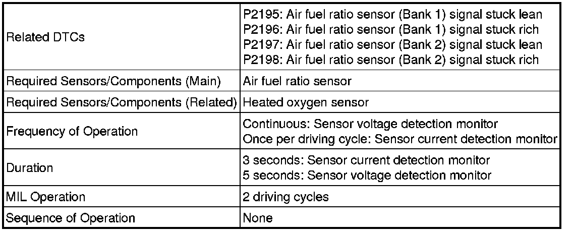 If the air fuel ratio sensor output is 2.2 mA or more for more than 3 seconds of cumulative time, the ECM interprets this as a malfunction in the air fuel ratio sensor and stores DTC P2195 or P2197 (stuck on high side). If the air fuel ratio sensor output is less than 0.8 mA for more than 3 seconds of cumulative time, the ECM stores DTC P2196 or P2198 (stuck on low side).