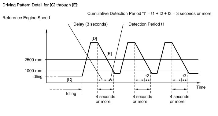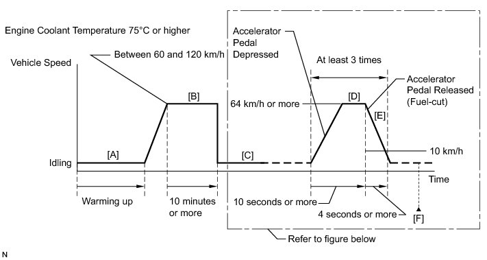 11. Soon after performing step [D] above, release the accelerator pedal for at least 4 seconds without depressing the brake pedal in order to execute fuel-cut control [E].