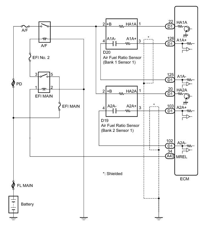 - The ECM regulates the voltages at the A1A+, A2A+, A1A- and A2A- terminals of the ECM to a constant level. Therefore, the air fuel ratio sensor output voltage cannot be confirmed without using the Techstream.