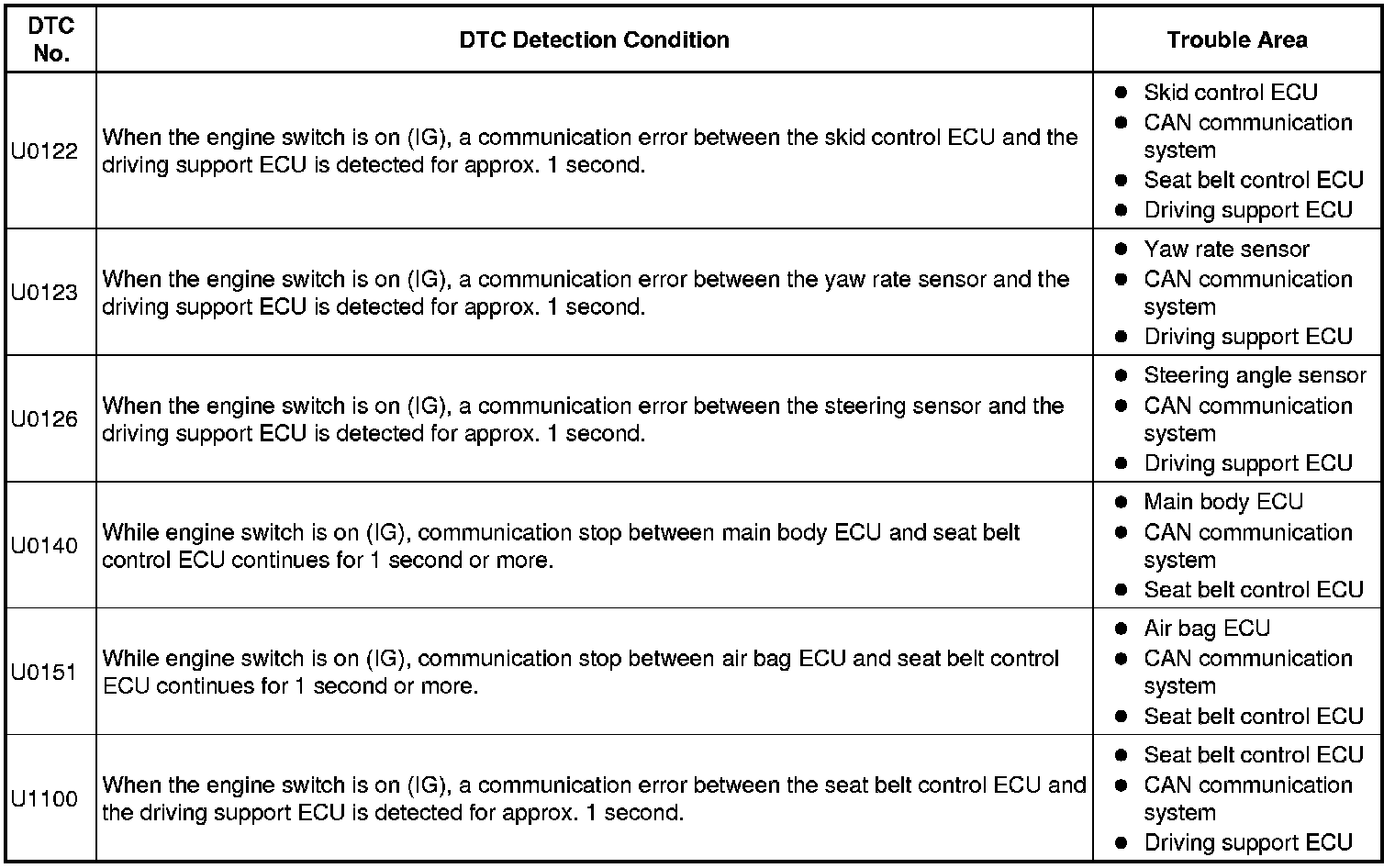 These DTCs are stored when a communication malfunction occurs between the sensors and ECUs that detect collisions, or between ECUs that perform the pre-collision control.