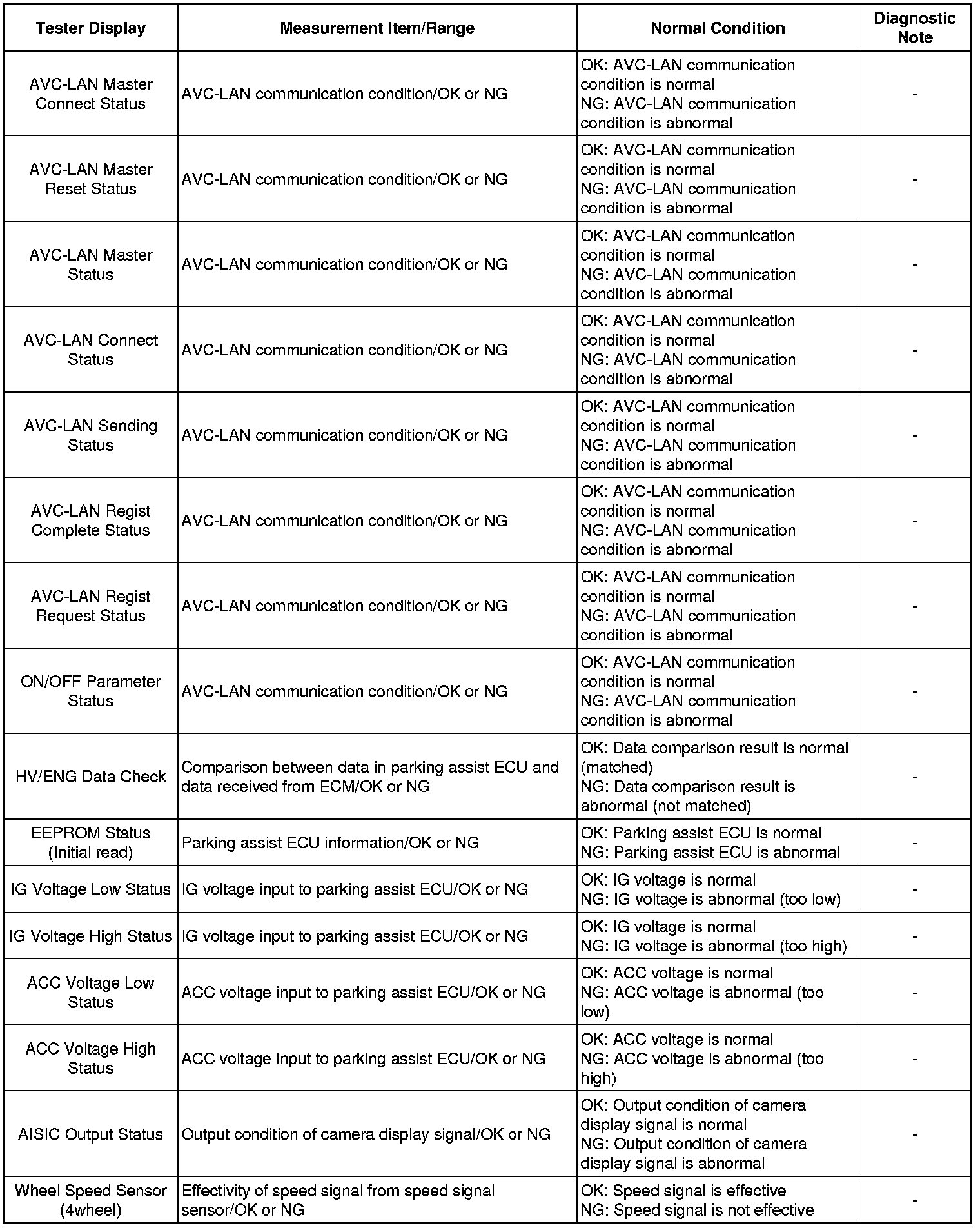 Using the Techstream to read the Data List allows the values or states of switches, sensors, actuators and other items to be read without removing any parts. This non-intrusive inspection can be very useful because intermittent conditions or signals may be discovered before parts or wiring is disturbed. Reading the Data List information early in troubleshooting is one way to save diagnostic time.