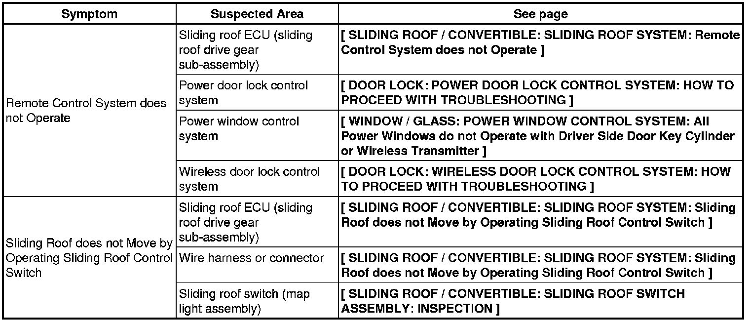 SLIDING ROOF / CONVERTIBLE: SLIDING ROOF SYSTEM: PROBLEM SYMPTOMS TABLE