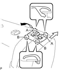 (b) Move the rear seat shoulder belt hole cover in the direction indicated by the arrow in the illustration to disengage the 2 claws (B) and remove the cover.