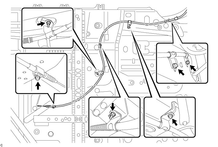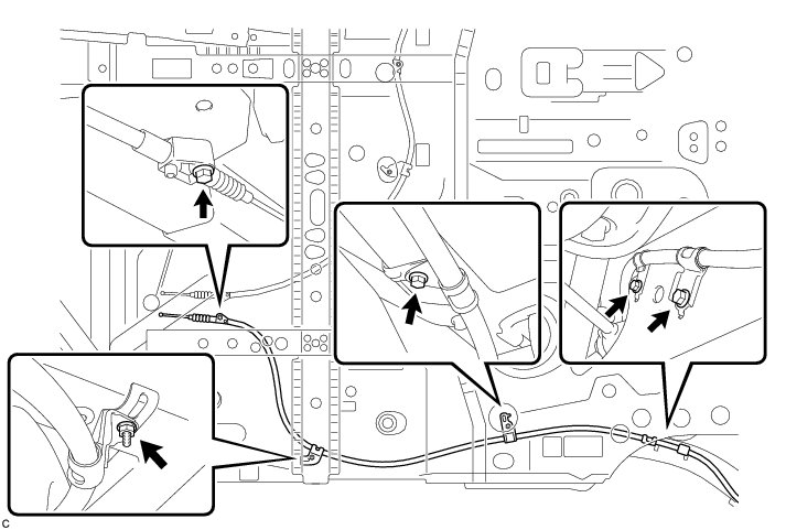 (c) Remove the parking brake cable support bracket, 2 cable support brackets and No. 2 cable support bracket from the No. 2 parking brake cable assembly.