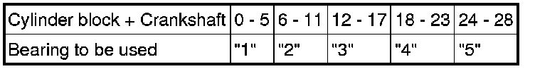 (i) If replacing a bearing, replace it with one having the same number. If the number of the bearing cannot be determined, select the correct bearing by adding together the numbers imprinted on the cylinder block and crankshaft, then refer to the table below for the appropriate bearing number. There are 5 sizes of standard bearings, marked "1", "2", "3", "4" and "5" accordingly.