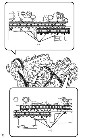 (d) Turn the camshaft timing gear assembly on bank 1 clockwise (approximately 60°) and set it as shown in the illustration. Be sure to loosen the chain sub-assembly between the banks.