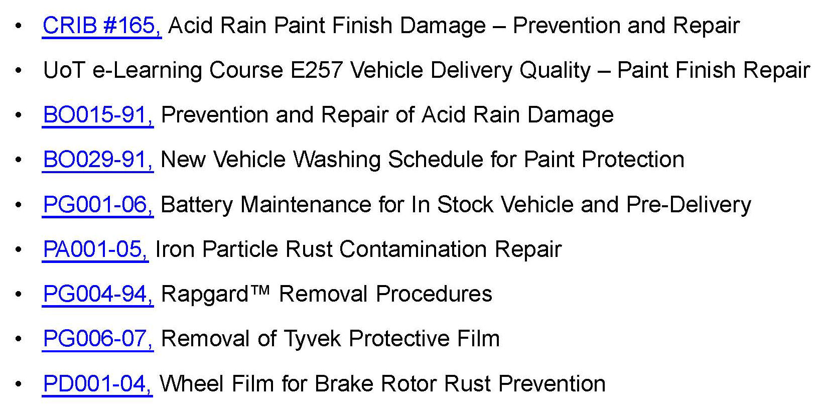 Here is a list of additional resources, which will help you with vehicle receipt, inspection and storage procedures.