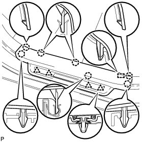 Engage the 4 clips, guide and 7 claws, and install the front door scuff plate LH.