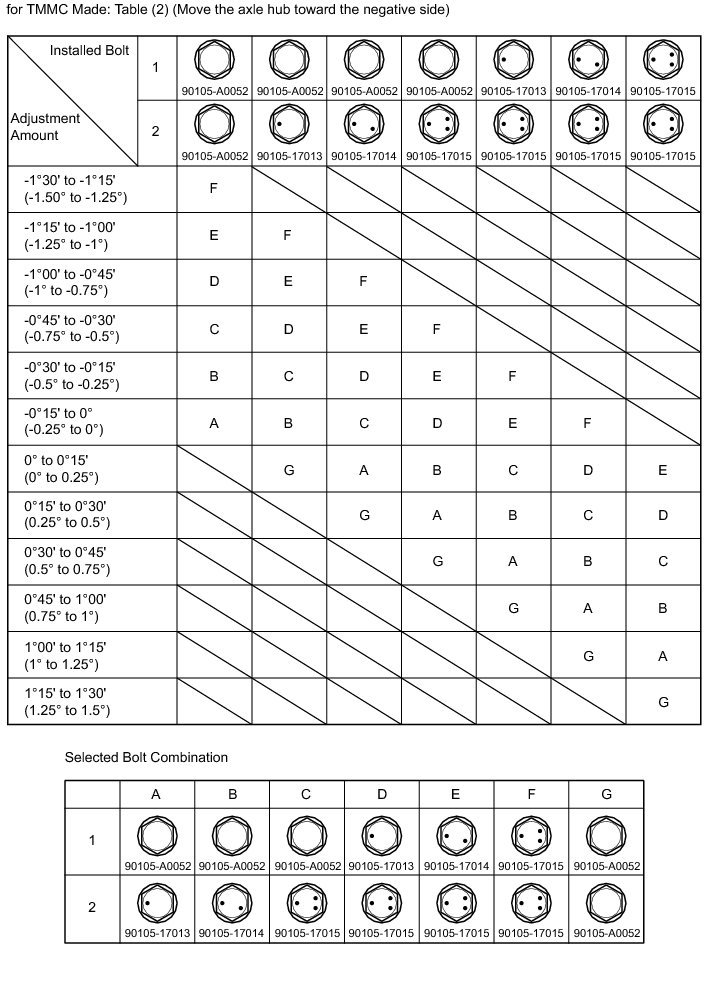 Check the combination of installed bolts. Select appropriate bolts from the table below to adjust the camber to the specified values.