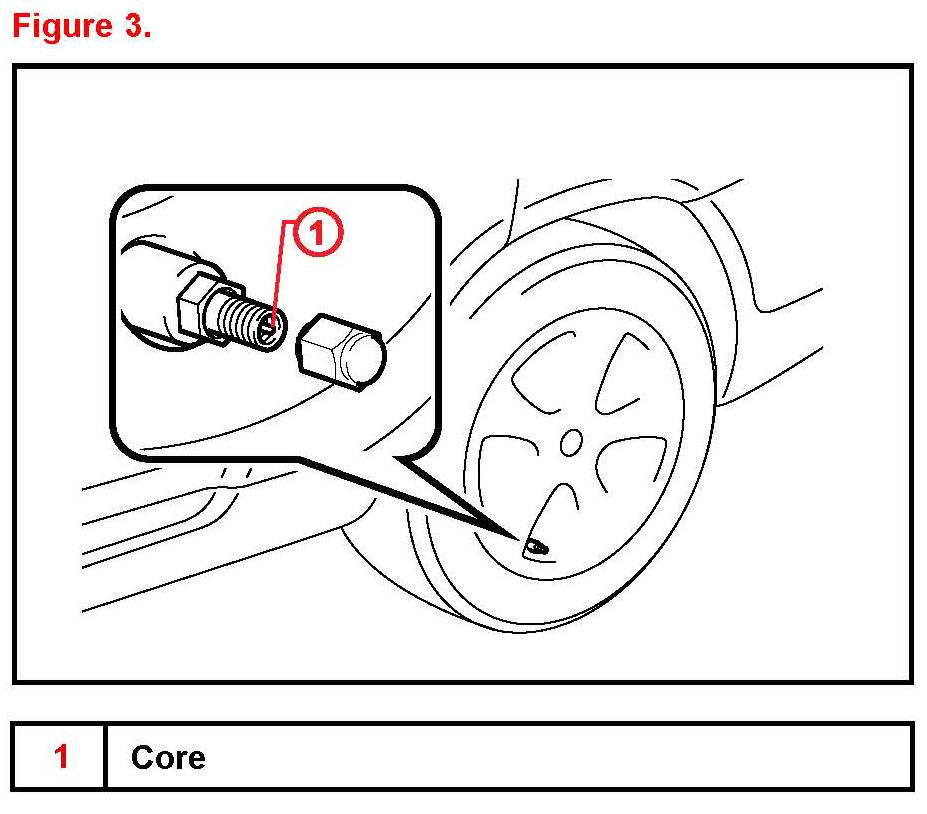 3. Press or remove the valve core to reduce the tire inflation pressure rapidly by 6 psi (0.4 kgf/sq.cm 40 kPa), or more, within 30 seconds.