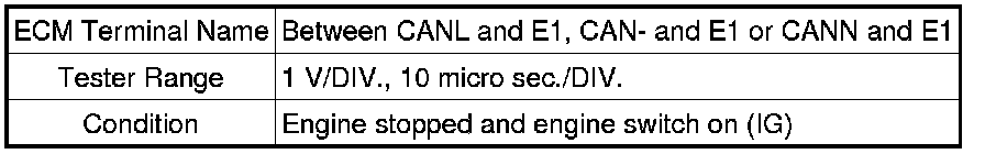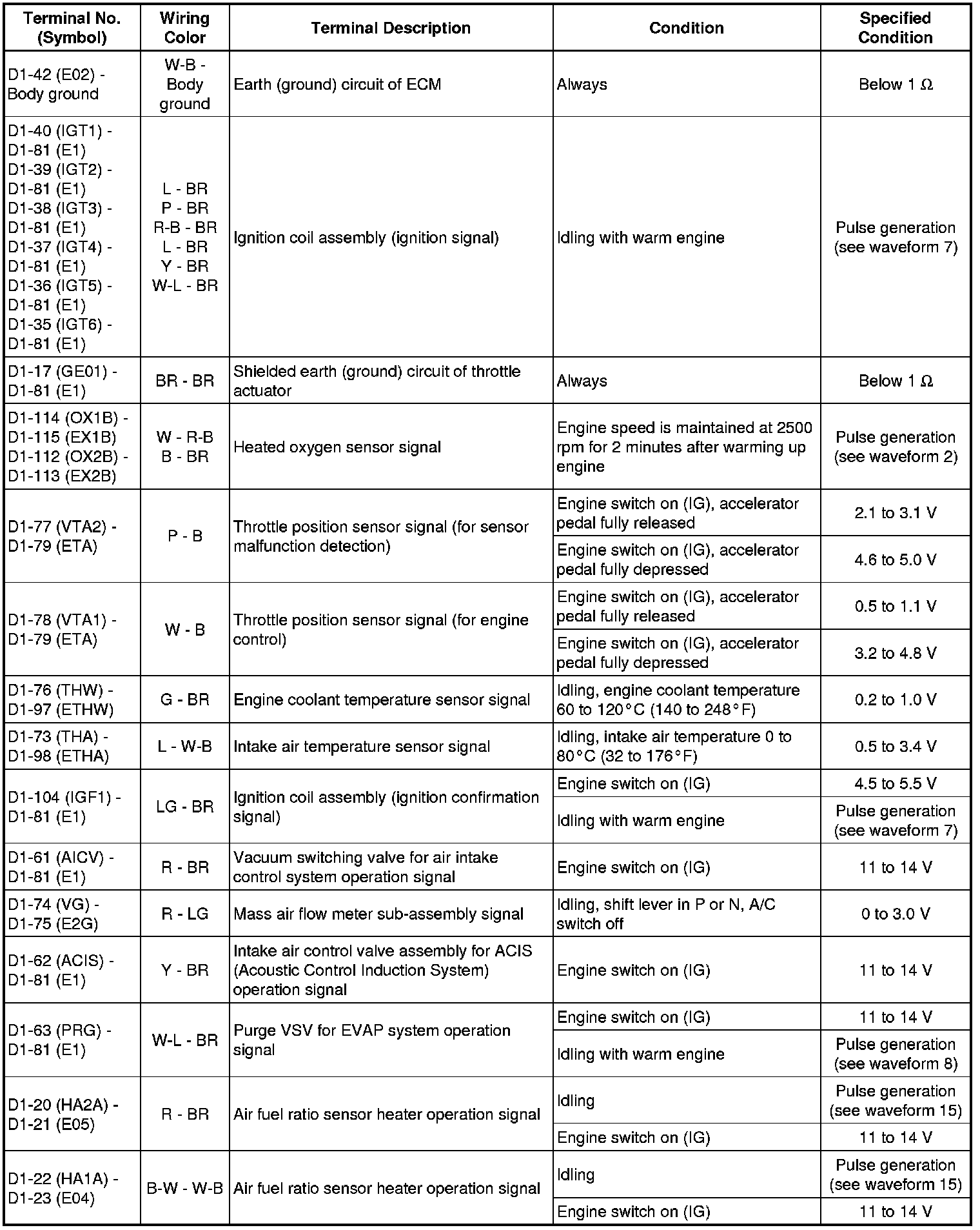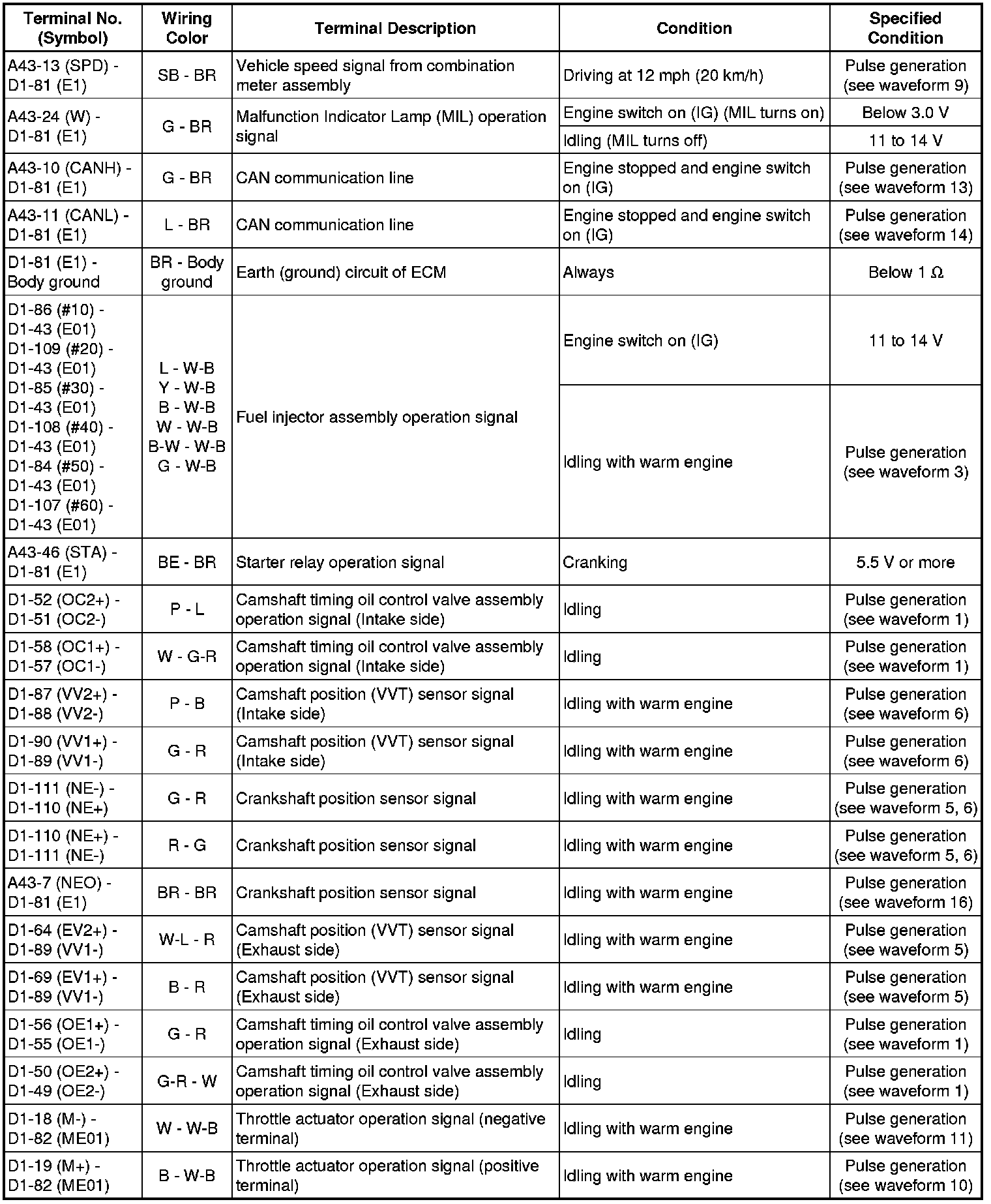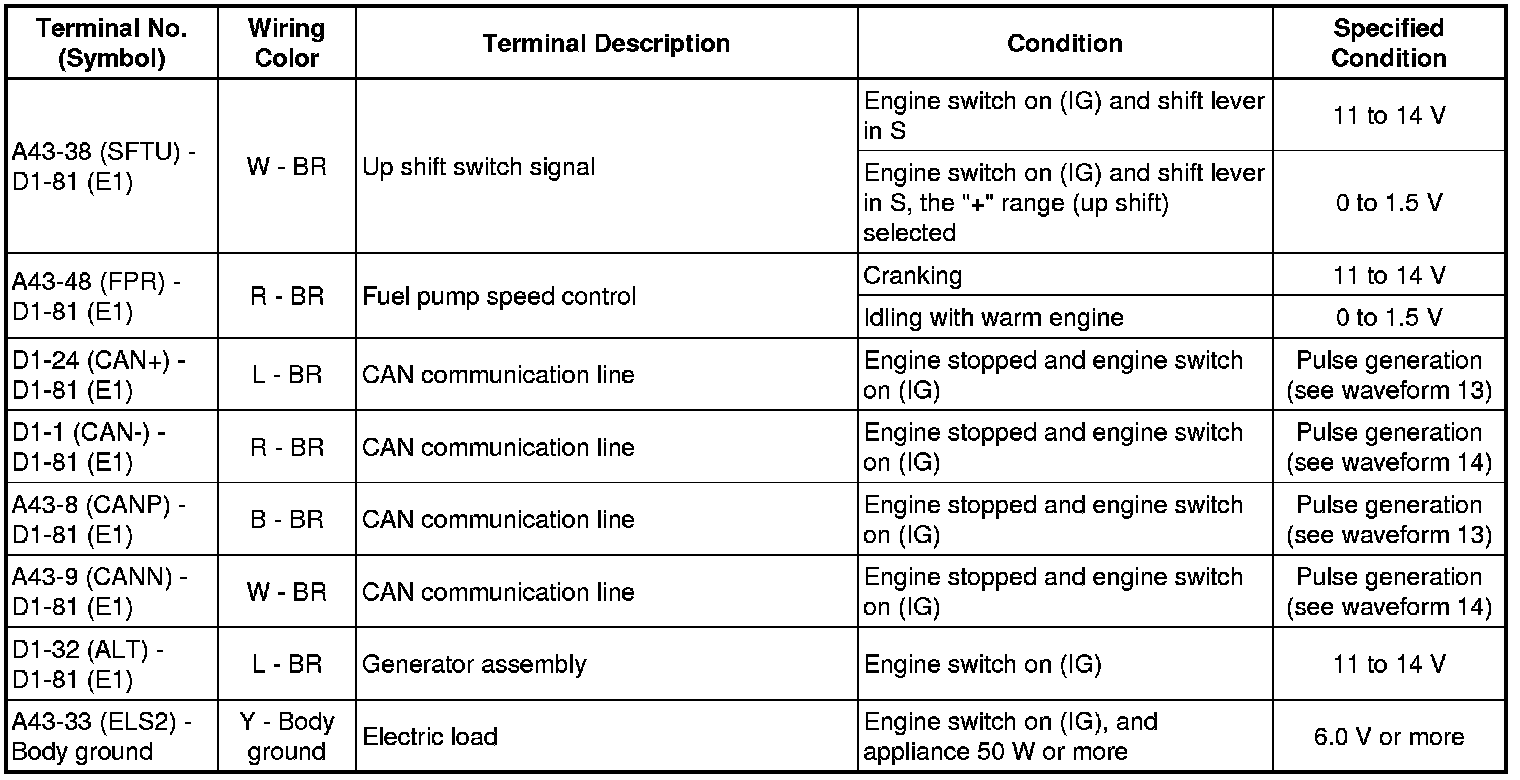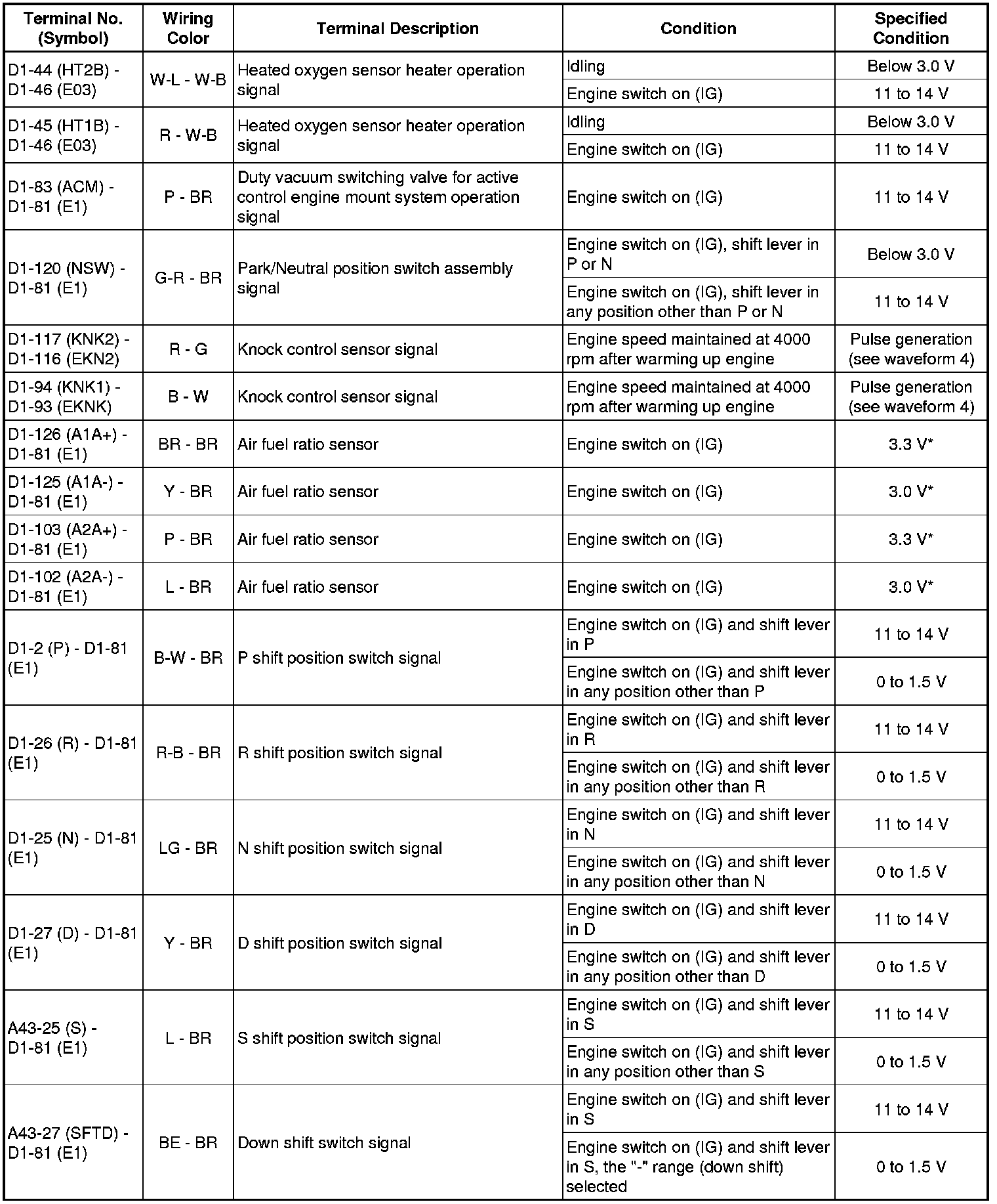 The standard normal voltage between each pair of the ECM terminals is shown in the table below. The appropriate conditions for checking each pair of the terminals are also indicated.