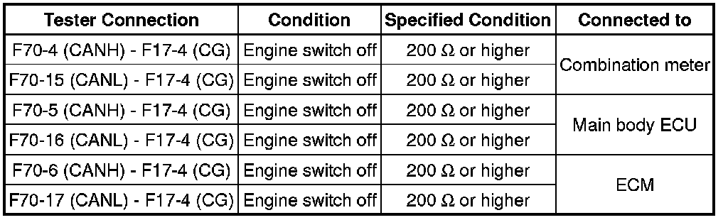 There may be a short circuit between the CAN bus main wire and GND when there is no resistance between terminals 6 (CANH) and 4 (CG) or 14 (CANL) and 4 (CG) of the DLC3.