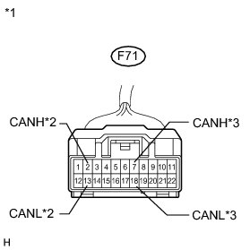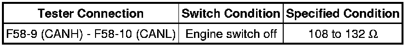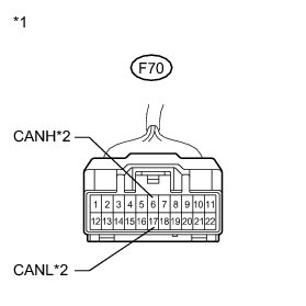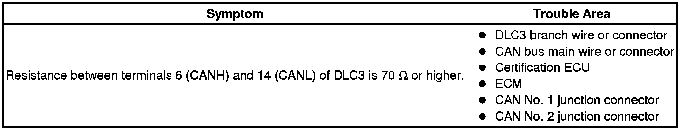 There may be an open circuit in the CAN bus main wire and/or the DLC3 branch wire when the resistance between terminals 6 (CANH) and 14 (CANL) of the DLC3 is 70 Ohms or higher.