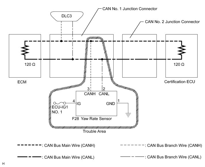 1. CHECK CAN BUS WIRE FOR DISCONNECTION (YAW RATE SENSOR BRANCH WIRE)
