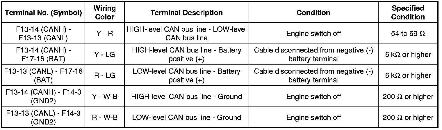 * Turn the engine switch off before measuring the resistances between CAN bus main wires and between CAN bus branch wires.