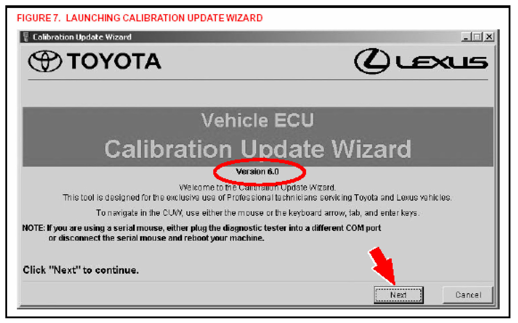 Verify that the CUW version is 6.0 or higher. If not, refer to the Note below. The CUW will guide you through the steps to download the calibration file to the Diagnostic Tester Program Card. Click NEXT on the first screen (Figure 7).