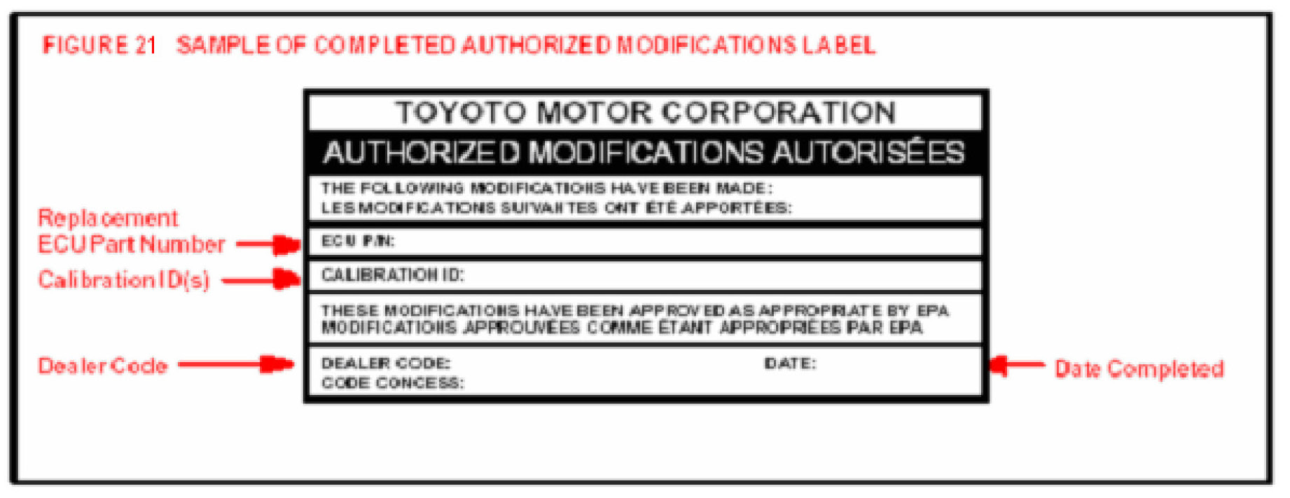 Modifications to ECU calibration files must be recorded and properly displayed on the vehicle using the calibration update sticker.