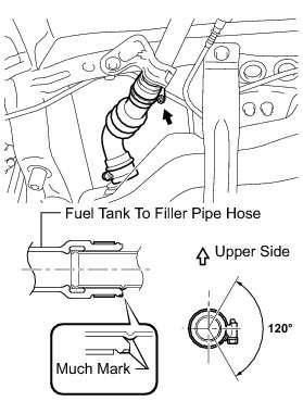 (f) Align the matchmarks and install the fuel tank to filler pipe hose to the fuel tank.