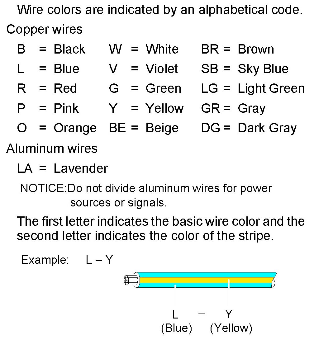 [K] : Indicates the ground point. The code consists of the two characters: A letter and number. The first character of the code indicates the alphabetical code allocated to the wire harness. The second character indicates a serial number used to distinguish between the ground points in cases when more than one ground point exist on the same wire harness.