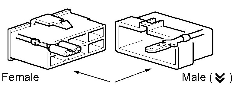 Symbol (Down Arrows) indicates the male terminal connector. Numbers outside connector codes indicate the pin numbers of both male and female connectors.
