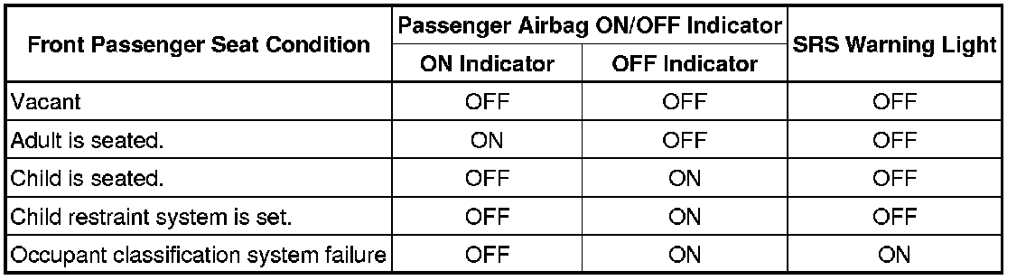 * When the occupant classification system has trouble, both the SRS warning light and passenger airbag ON/OFF indicator ("OFF") come on. In this case, check the DTCs in the airbag system first.