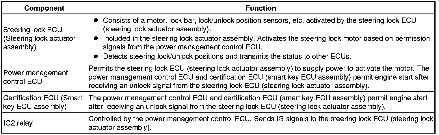 (a) The steering lock system locks/unlocks the steering wheel when by activating the steering lock bar with a motor. The steering lock ECU (steering lock actuator assembly) activates the motor based on signals from the certification ECU (smart key ECU assembly) and power management control ECU.