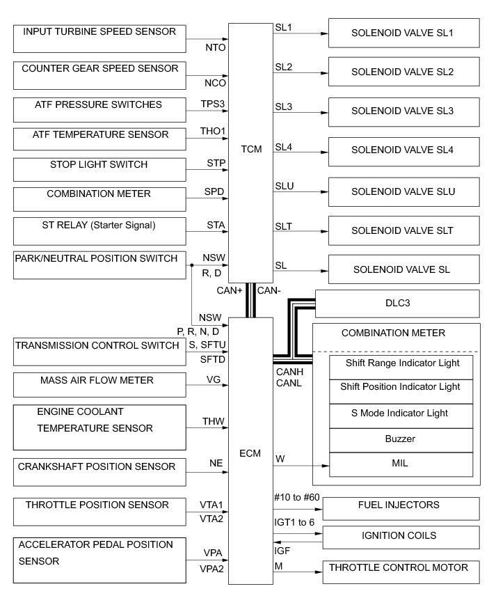 The configuration of the electronic control system in the U660F automatic transaxle is as shown in the following chart.