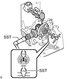 (c) Using SST, rotate the rear differential case assembly forward and backward, and measure the backlash.