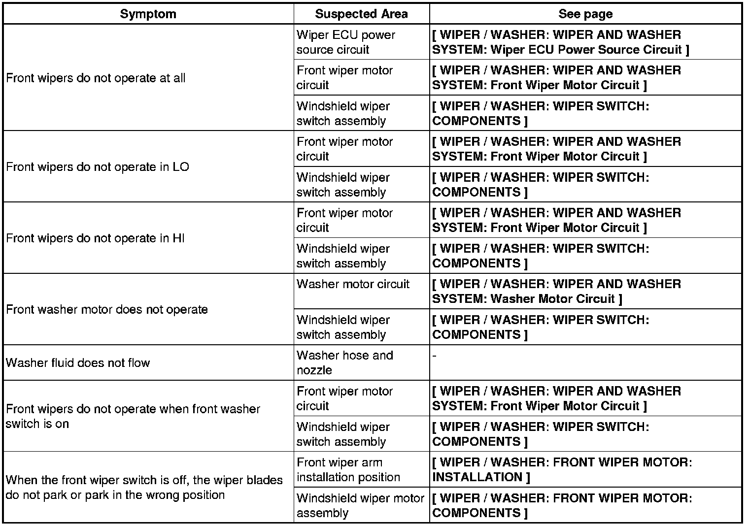 WIPER / WASHER: WIPER AND WASHER SYSTEM: PROBLEM SYMPTOMS TABLE