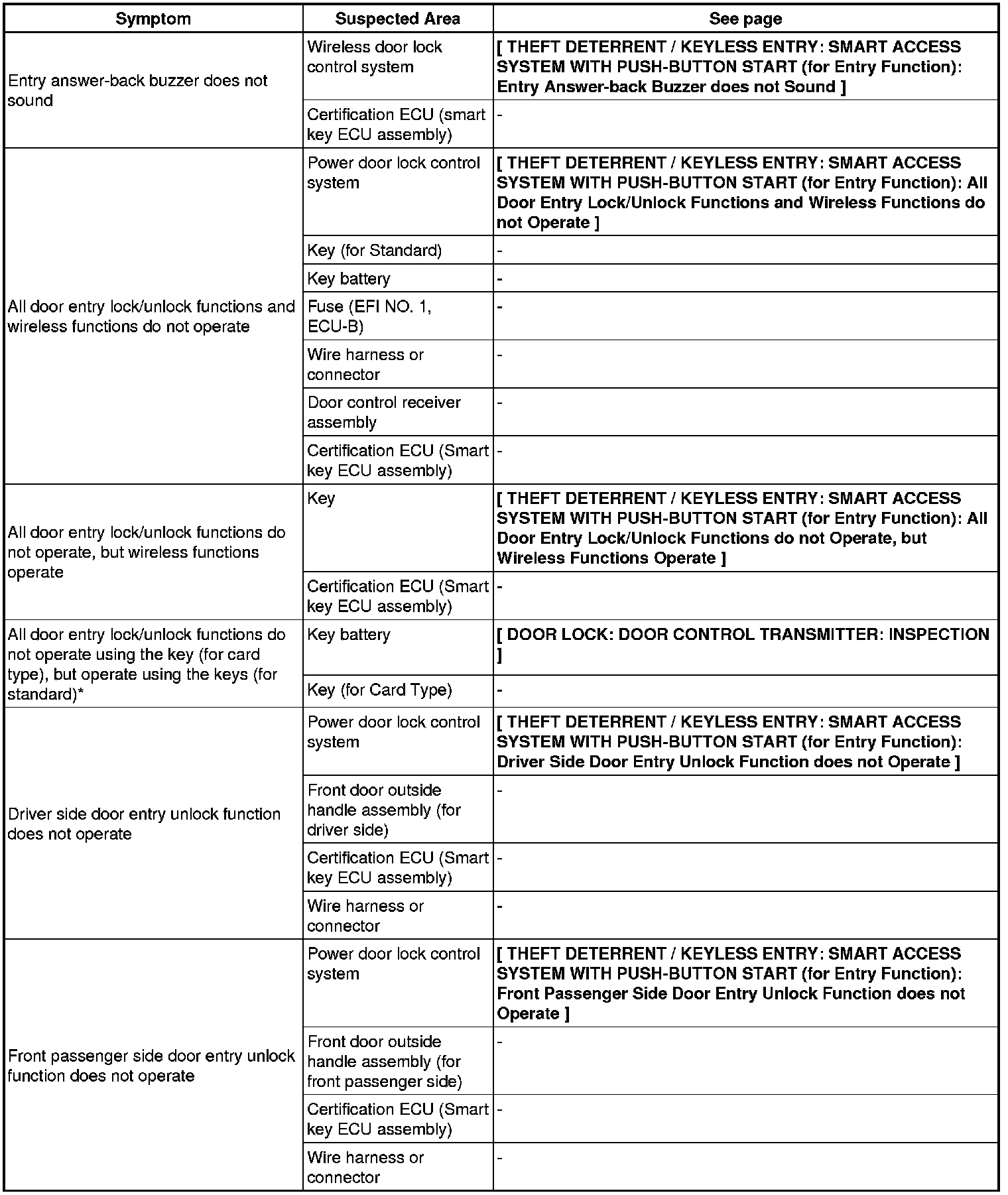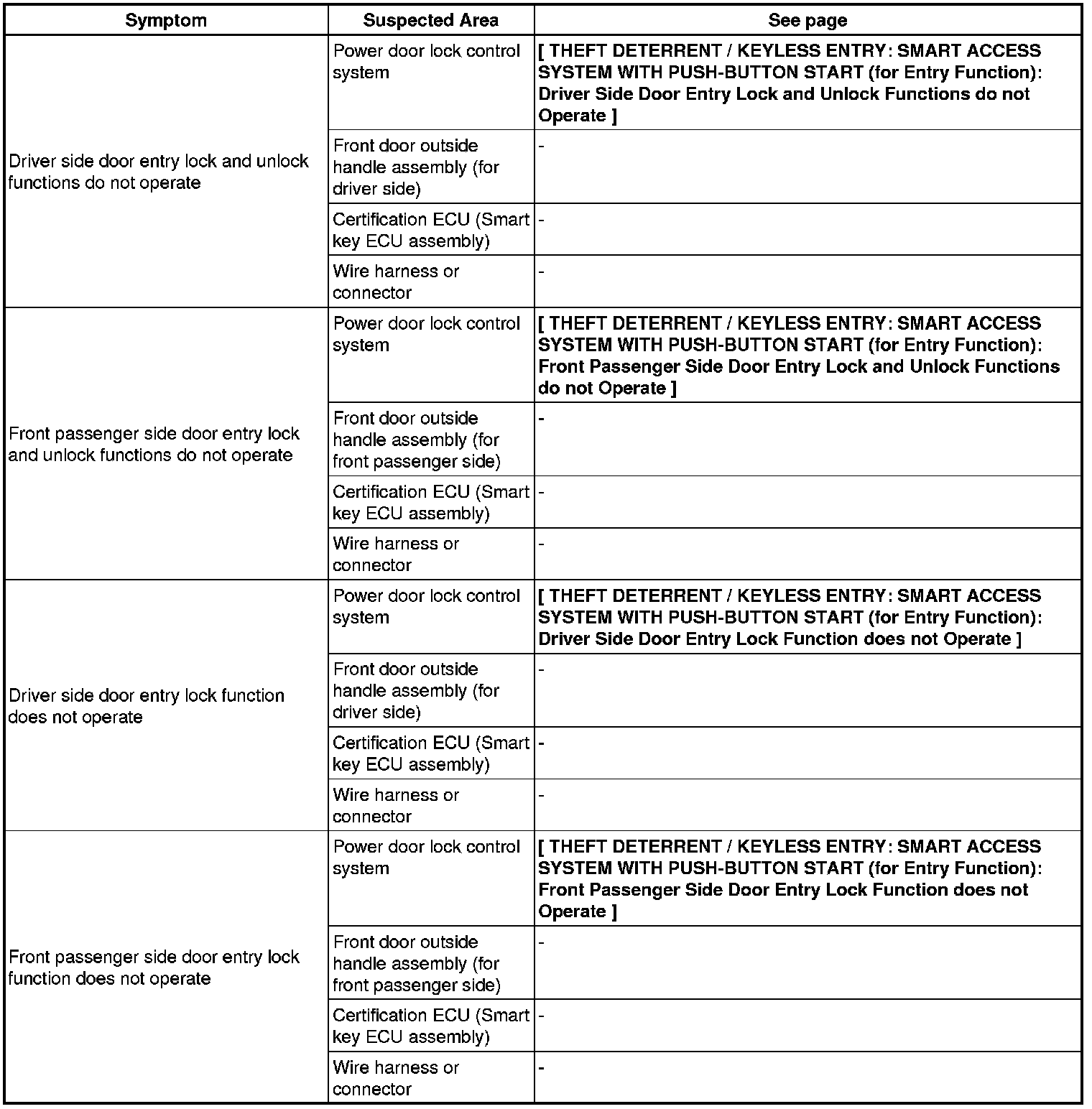THEFT DETERRENT / KEYLESS ENTRY: SMART ACCESS SYSTEM WITH PUSH-BUTTON START (for Entry Function): PROBLEM SYMPTOMS TABLE