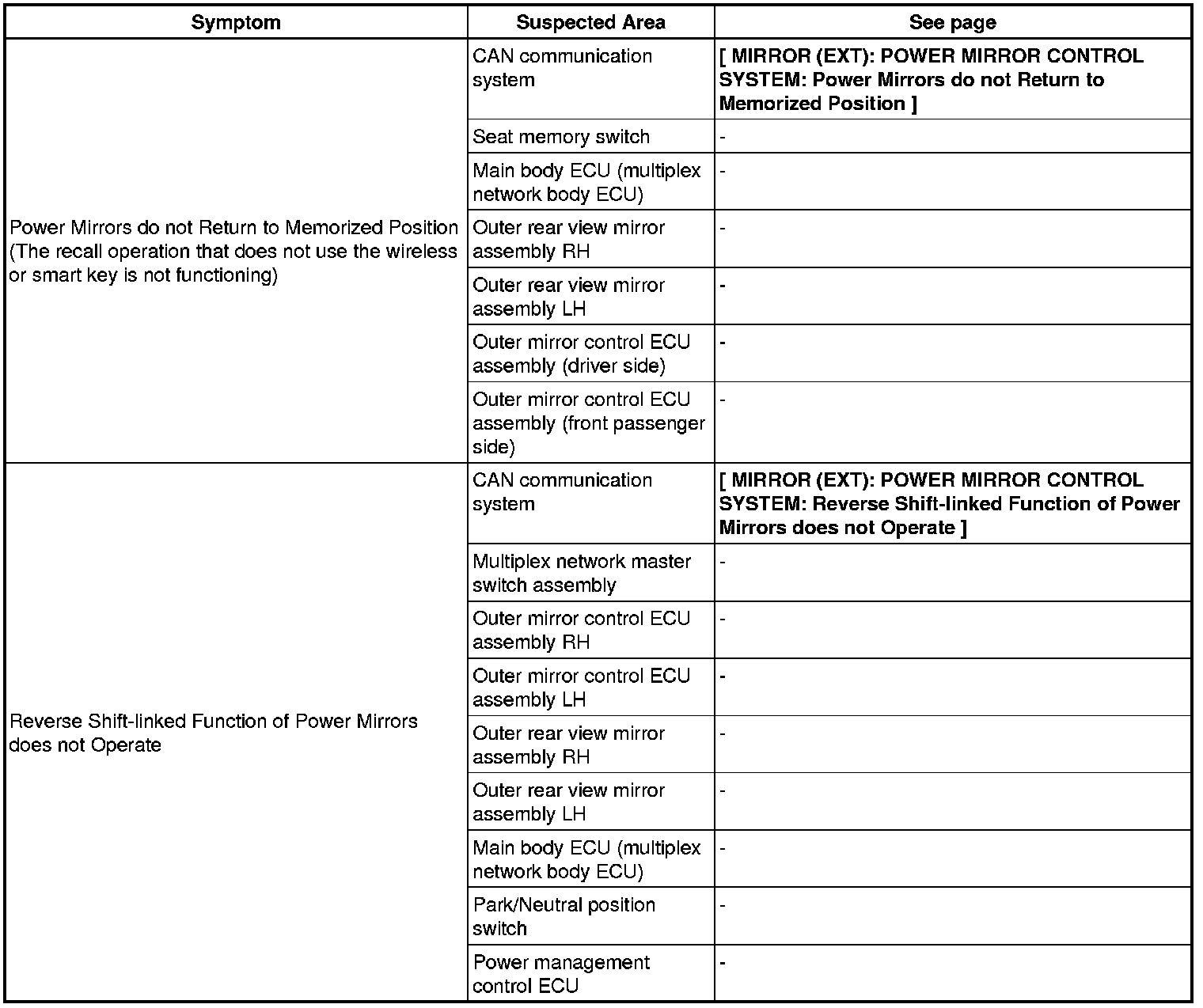 MIRROR (EXT): POWER MIRROR CONTROL SYSTEM: PROBLEM SYMPTOMS TABLE