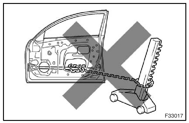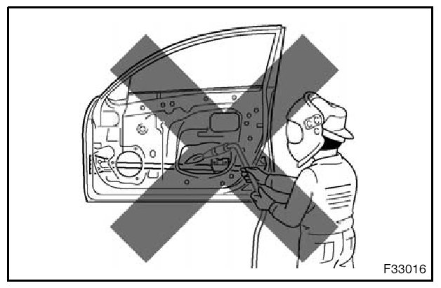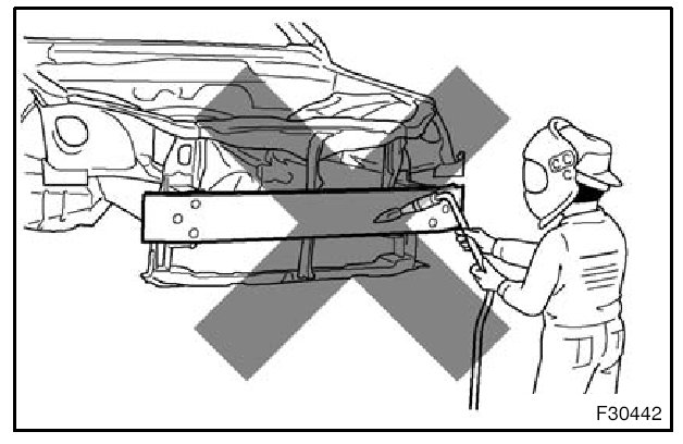 1. Rustproof high strength steel sheets are used for the body frame. Therefore, if these parts are heat repaired using an acetylene torch or equivalent, the crystalline structure changes, causing the strength of the steel sheets to decrease. Also, the zinc coating which is used to protect the body from rust will be damaged. This causes the surface of the steel sheets to become oxidized, which reduces their ability to resist rust.
