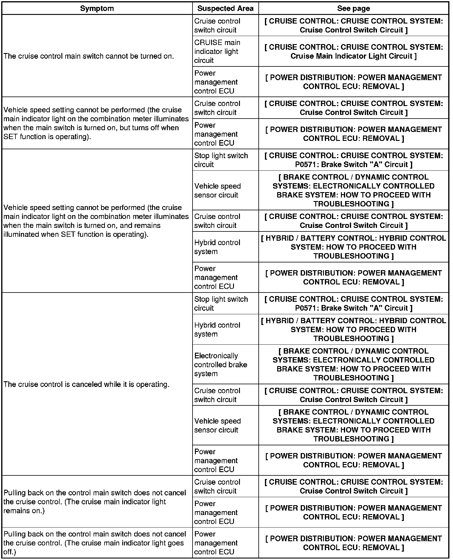 CRUISE CONTROL: CRUISE CONTROL SYSTEM: PROBLEM SYMPTOMS TABLE