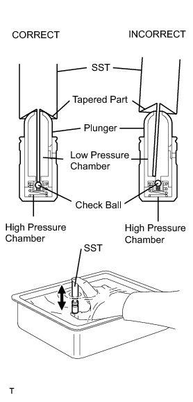 When bleeding air from the high-pressure chamber, make sure that the tip of SST is actually pressing the check ball as shown in the illustration. If the check ball is not pressed, air will not bleed.